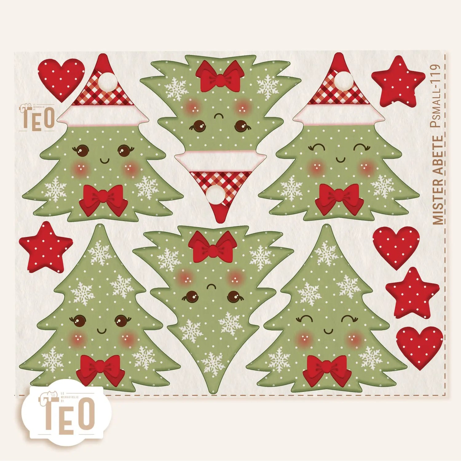 Un allegro boschetto di piccoli abeti con faccina e fiocco rosso, perfetti da appendere all’albero; usare come segnaposto o regalare come pensierino natalizio. Il pannello include anche cuori e stelle coordinati.